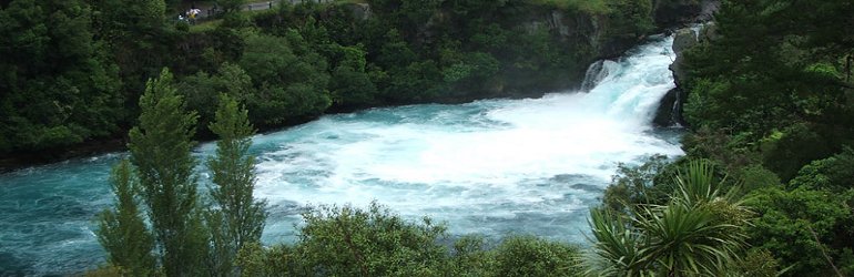 HUKA FALLSA popular tourist attraction near Taupo, New Zealand, The Huka Falls are a set of waterfalls on the Waikato River that drains from Lake Taupo. A few hundred metres upstream from the Huka Falls, the Waikato River narrows from roughly 100 metres across into a narrow canyon only 15 metres across. The volume of water flowing through often approaches 220,000 litres per second. At the top of the falls is a set of small waterfalls dropping over about 8 metres. The most impressive, final stage of the falls is an 11 metre drop. The drop is technically six metres (cliff beneath the water) but the water flow raises the level to 11m. Hukafalls Jet takes tourists within a few meters of the bottom of the final stage. The narrow canyon, with the tourist bridge visible at the top left.The falls were brought to national attention in February 1989 when the body of cricket umpire, Peter Plumley-Walker was found immediately downsteam, with wrists and ankles bound. The resulting investigation lifted the lid on the Auckland bondage scene and the prurient news media had a field day. The falls are a popular tourist attraction, being close to Taupo and readily accessible from State Highway One.
